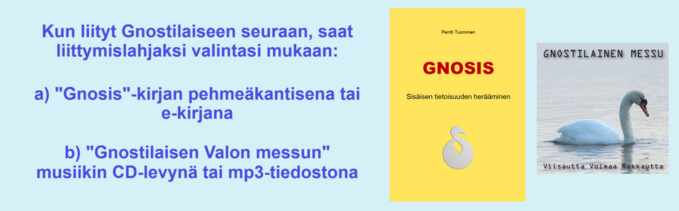 Lisäksi saat mahdollisuuden ostaa 20 % alennuksella yhden Gnostilaisen seuran verkkokaupassa myynnissä olevista kirjoista.